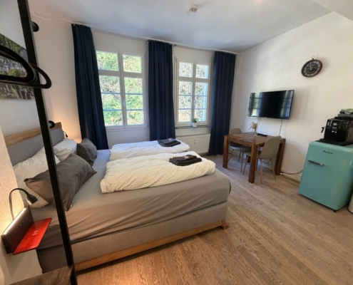 Der besondere Charme des Zimmers liegt in der harmonischen Kombination aus historischem und modernem Stil. Der Parkettboden ergänzt sich wunderbar mit den antiken Möbeln und verleiht dem Raum eine warme und einladende Atmosphäre. Das moderne Boxspringbett sorgt für erholsame Nächte, während der Smart-TV und das moderne Badezimmer zum Verweilen einladen.